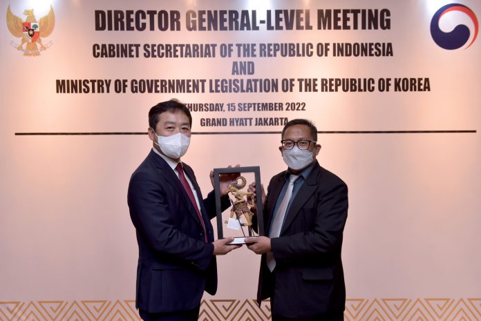 SuaraPemerintah.ID – Deputi Bidang Polhukam Setkab, Purnomo Sucipto menerima kunjungan Director General of Ministry of Government Legislation (Moleg) Republic of Korea Choe Young-chan beserta delegasi di Hotel Grand Hyatt, Jakarta, Kamis (15/09/22) pagi. Pertemuan ini bertujuan untuk membahas kelanjutan kerja sama antara kedua lembaga.