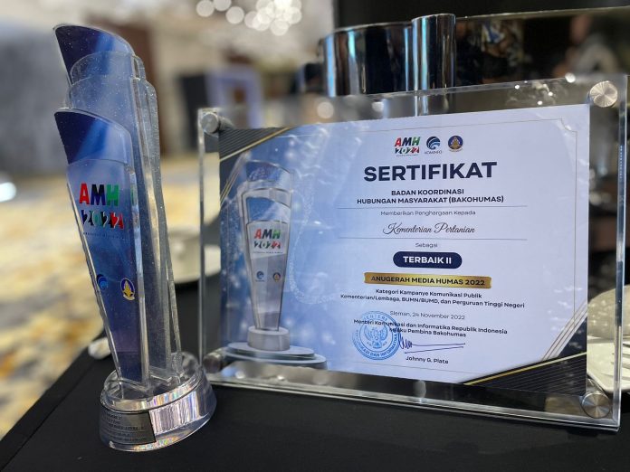 SuaraPemerintah.ID – Kementerian Pertanian atau Kementan berhasil meraih penghargaan Kehumasan dalam Anugerah Media Humas (AMH) 2022 kategori Kampanye Komunikasi Publik yang diselenggarakan Bakohumas dan Kementerian Komunikasi dan Informatika (Kemenkominfo).