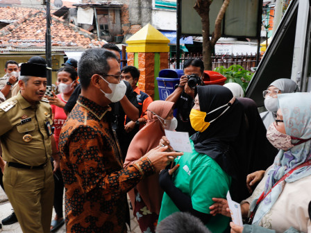 Dalam kesempatan itu, Pj Gubernur DKI menyempatkan diri untuk berdialog dengan warga yang sedang belanja produk pangan murah yang disediakan PT Food Station Tjipinang Jaya.
