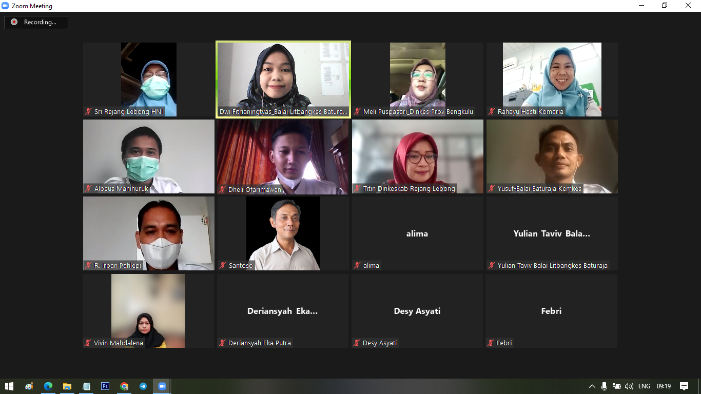 Dihadiri oleh Kasi P2PM Dinas Kesehatan Provinsi Bengkulu, Kasi P2PTM Dinas Kesehatan Kabupaten Rejang Lebong, perwakilan Bidan Desa Apur, Kecamatan Sindang Beliti Ulu, Kab. Rejang Lebong dan tim Penelitian Balai Litbangkes Baturaja, pertemuan penyampaian Rekomendasi Kebijakan dilakukan secara daring melalui Zoom meeting pada Kamis (24/11) pukul 09.00 WIB s.d. selesai.