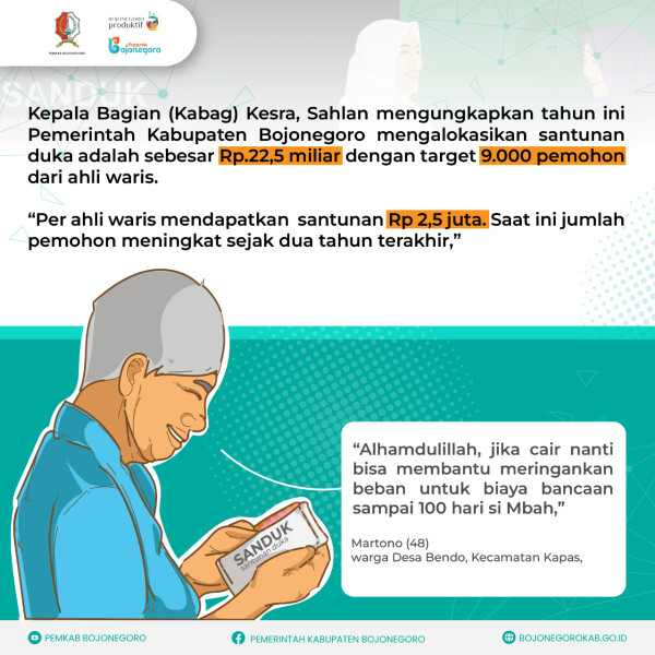 Kepala Bagian (Kabag) Kesra, Sahlan mengungkapkan tahun ini Pemerintah Kabupaten Bojonegoro mengalokasikan santunan duka adalah sebesar Rp.22,5 miliar dengan target 9.000 pemohon dari ahli waris.