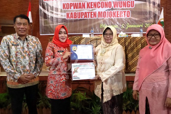 Di penghujung kegiatan, Bupati Mojokerto menyerahkan Sertifikat Pemeringkatan Koperasi dan Sertifikat Hasil Penilaian Kesehatan Koperasi Kabupaten Mojokerto kepada pengurus Kopwan Kencono Wungu.