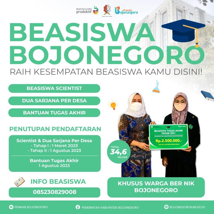 Beasiswa dari Pemkab Bojonegoro, lanjut Suyanto, ada tiga jenis. Yaitu Beasiswa Scientist, Beasiswa Dua Sarjana Per Desa, dan juga Beasiswa Bantuan Tugas Akhir.
