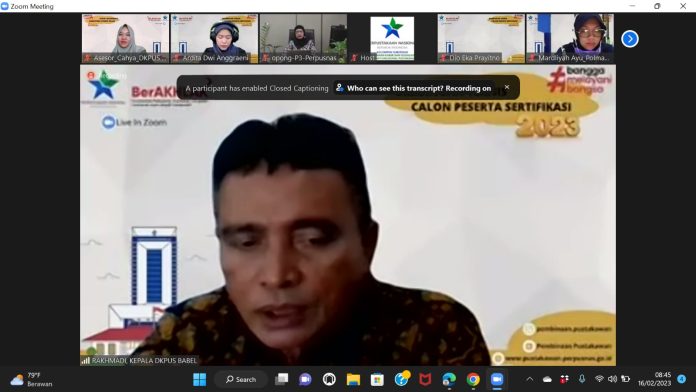 Kegiatan yang diselenggarakan oleh Pusat Pembinaan Pustakawan Perpustakaan Nasional (Perpusnas) RI selama sehari, Kamis (16/2/2023) via zom meeting itu, dibuka Kepala Dinas Kearsipan dan Perpustakaan (DKPUS) Babel Rakhmadi, dan dihadiri Kepala Pusat Pembinaan Pustakawan Perpusnas Opong Sumiati, Kabid Pembinaan dan Pengembangan Perpustakaan DKPUS Babel, Abu Hapas.