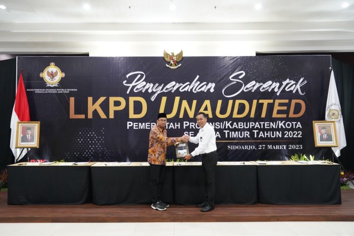 SuaraPemerintah.ID –Â Laporan Keuangan Pemerintah Daerah (LKPD) Unaudited tahun 2022 Pemerintah Kabupaten Sidoarjo diserahkan Bupati Sidoarjo H. Ahmad Muhdlor, S.IP kepada Kepala Perwakilan BPK Provinsi Jawa Timur Karyadi, di kantor BPK Perwakilan Jatim, Senin (27/3). Penyerahan LKPD tersebut serentak bersama 38 Pemerintah Daerah di Jawa Timur. Terkecuali Kota Madiun yang telah menyerahkannya di bulan Januari lalu. Dalam kesempatan itu Gubernur Jawa Timur Hj. Khofifah Indar Parawansa juga menyerahkan langsung LKPD Unaudited 2022 Provinsi Jawa Timur.