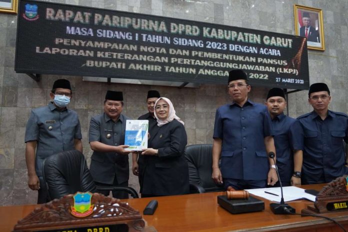 SuaraPemerintah.ID – Bupati Garut Rudy Gunawan bersama Wakil Bupati (Wabup) Garut Helmi Budiman menghadiri Rapat Paripurna Dewan Perwakilan Rakyat Daerah (DPRD) Kab. Garut Masa Sidang I tahun 2023 dengan acara penyerahan nota dan pembentukan Pansus Laporan Keterangan Pertanggungjawaban (LKPJ) Bupati akhir tahun 2022 di ruang paripurna DPRD Garut, Senin (27/03/2023).