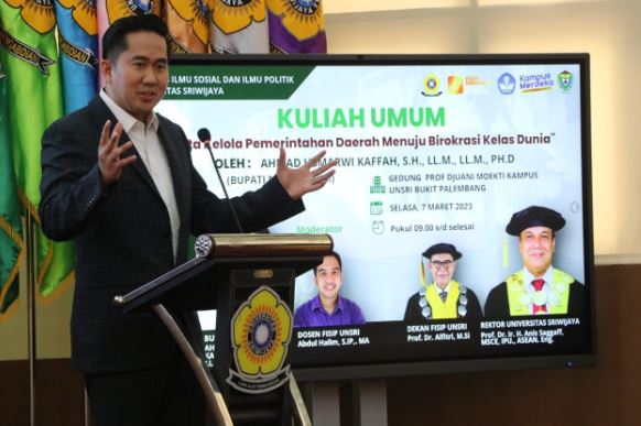 SuaraPemerintah.ID – Kuliah Umum bersama Mahasiswa Fakultas Ilmu Sosial dan Politik (Fisip) Universitas Sriwijaya (Unsri) dengan tema “Tata Kelola Pemerintahan Daerah Menuju Birokrasi Kelas Dunia”, Pelaksana Tugas (Plt) Bupati Muara Enim paparkan 5 (lima) langkah strategis Pemerintah Kabupaten Muara Enim dalam menjalan birokrasi pemerintahan, Selasa (7/3) di Ruang Prof. Djuani Mukti, UPT Lab Bahasa Kampus Bukit Besar Palembang