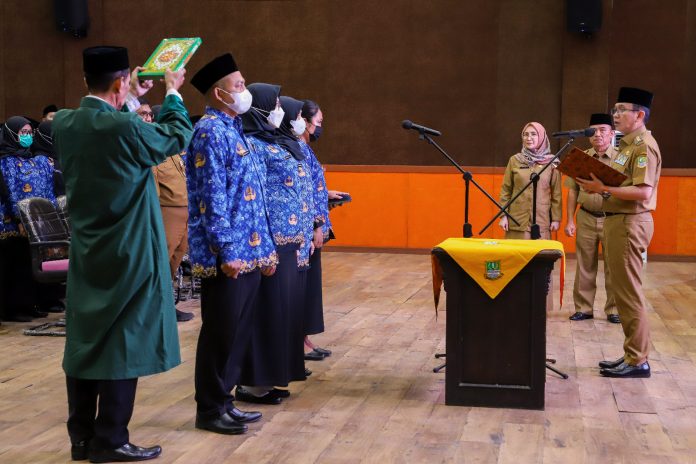 SuaraPemerintah.ID – Pj Bupati Bekasi Dani Ramdan mengambil sumpah janji 164 Pegawai Pemerintah dengan Perjanjian Kerja (P3K) Jabatan Fungsional Tenaga Kesehatan di lingkungan Pemkab Bekasi tahun 2022 yang digelar di aula KH. Noer Alie kantor Bupati Bekasi pada Senin (03/04).