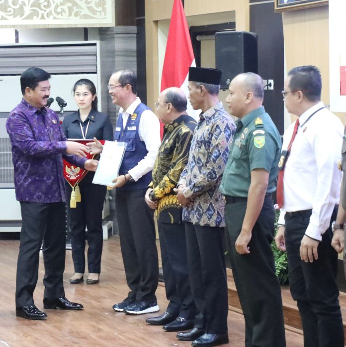 SuaraPemerintah.ID –Â Menteri ATR/BPN, Hadi Tjahjanto menyerahkan 2.122 sertipikat aset Barang Milik Daerah (BMD), Barang Milik Negara (BMN), dan Badan Usaha Milik Negara (BUMN) di Gedung Graha Bina Praja, Palembang, Sumatra Selatan, pada Rabu (12/04/2023). Hal ini sejalan dengan arahan Presiden Republik Indonesia (RI), Joko Widodo untuk melakukan percepatan sertipikasi tanah di seluruh Indonesia, baik tanah masyarakat, pemerintah, hingga rumah ibadah.