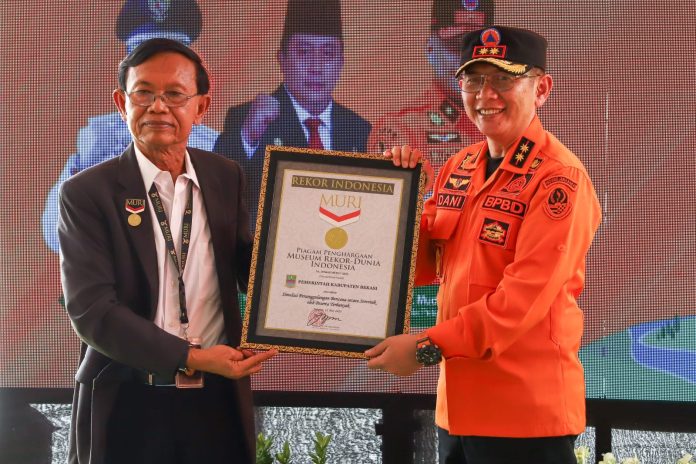 SuaraPemerintah.ID – Pemerintah Kabupaten Bekasi berhasil memecahkan Rekor MURI (Museum Rekor Dunia Indonesia) dalam simulasi evakuasi penanggulangan bencana dengan peserta terbanyak yang diikuti 23.000 peserta dari berbagai dinas, instansi, TNI/Polri, dunia pendidikan, dunia usaha, komunitas penggiat bencana dan unsur masyarakat lainnya.