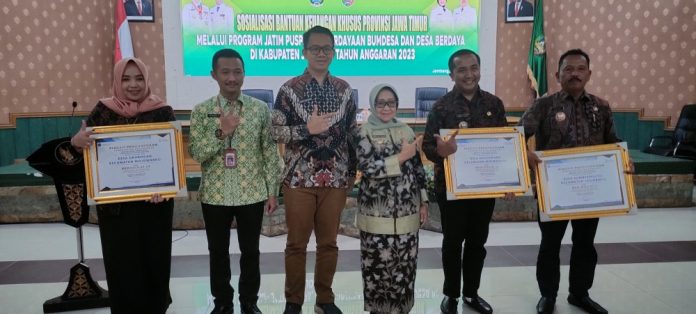 “Alhamdulillah, kemarin saya menerima Penghargaan ini dari Kementerian Keuangan RI melalui Kanwil Dirjend Perbendaharaan Wilayah Provinsi Jawa Timur, dan kebetulan hari ini langsung saya serahkan, karena bertepatan dengan agenda Sosialisasi Bantuan Keuangan Khusus (BKK) Provinsi Jawa Timur Melalui Program Jatim Puspa Pemberdayaan BUMDesa dan Desa Berdaya Di Kabupaten Jombang TA 2023 di Ruang Bung Tomo”, tambah Bupati Mundjidah Wahab.