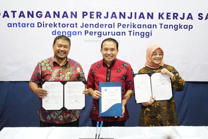 Penandatangan kerja sama (PKS) dilakukan oleh Plt. Direktur Jenderal Perikanan Tangkap Agus Suherman bersama perwakilan 10 perguruan tinggi di Semarang, Jawa Tengah pada Minggu 9 Juli 2023.