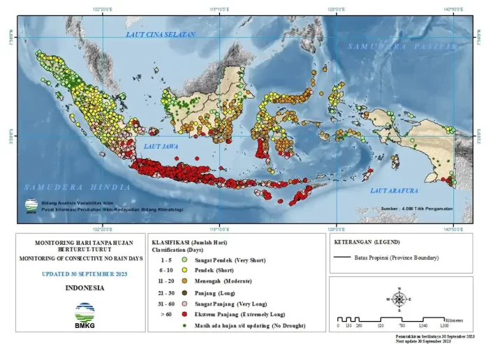 Dari laporan tersebut, hampir di seluruh Pulau Jawa, Bali, Nusa Tenggara Barat dan Timur masuk dalam kategori tidak mengalami hujan ekstrem panjang. Dengan capaiannya lebih dari 60 hari.