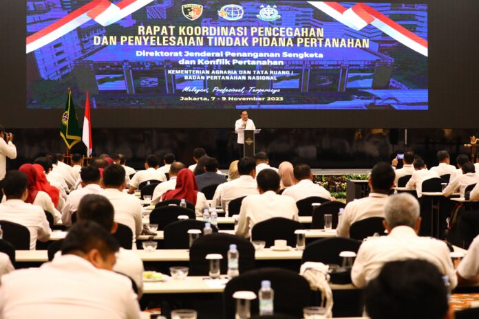 SuaraPemerintah.ID – Kementerian ATR/BPN melalui Direktorat Jenderal Penanganan Sengketa dan Konflik Pertanahan (Ditjen PSKP) menggelar Rapat Koordinasi Pencegahan dan Penyelesaian Tindak Pidana Pertanahan di Hotel Grand Mercure Jakarta Kemayoran, pada Selasa (07/11/23)