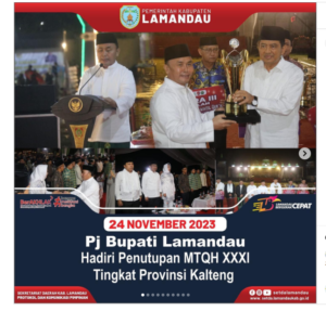Jumat (24/11), bertempat di Arena Utama Lapangan Sampuraga Pangkalan Bun, Kabupaten Kotawaringin Barat, Pj Bupati Lamandau menghadiri Penutupan Musabaqah Tilawatil Qur`an dan Hadits (MTQH) XXXI Tingkat Provinsi Kalteng Tahun 2023. Acara yang secara resmi ditutup oleh Gubernur Kalteng, dihadiri oleh Forkopimda Prov. Kalteng, Kepala Daerah se-Kalteng, dan undangan lainnya.