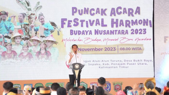 “Mestinya yang didahulukan adalah pembangunan sumber daya manusia, pelestarian kebudayaan, merawat kebudayaan yang ada. Jangan sampai nanti tergerus oleh budaya-budaya dari luar, budaya-budaya asing,” ujar Presiden saat menghadiri Festival Harmoni Budaya Nusantara di Lapangan Taruna, Kecamatan Sepaku, Kabupaten Penajam Paser Utara, pada Jumat, 3 November 2023. Acara ini digelar oleh Kemenko PMK bersama Pemda setempat.