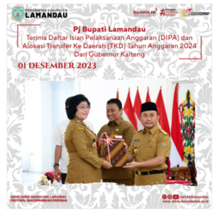 Jumat (01/12), bertempat di Istana Isen Mulang, Palangka Raya, Pj Bupati Lamandau menerima Daftar Isian Pelaksanaan Anggaran (DIPA) dan Alokasi Transfer Ke Daerah (TKD) Tahun Anggaran 2024 yang diserahkan oleh Gubernur Kalteng. Turut hadir Wakil Gubernur Kalteng , Unsur Forkopimda Prov. Kalteng, Bupati, Pj. Bupati dan Pj. Wali Kota se-Kalteng serta undangan lainnya.