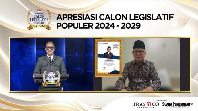 Apresiasi Calon Legislatif Populer 2024-2029 diserahkan secara virtual oleh SuaraPemerintah.ID kepada Mukhtarudin pada, Kamis (21/12/23).