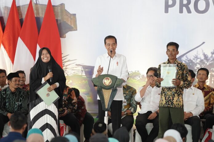 “Dulu tahun 2015, setiap saya ke desa, setiap saya ke kampung, ngecek infrastruktur, setiap saya ke daerah ke mana pun, provinsi mana pun, yang saya dengar adalah sengketa dan konflik lahan, selalu,” tutur Presiden Jokowi.