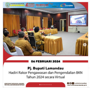 Nanga Bulik – Selasa (06/02), Pj. Bupati Lamandau didampingi Sekretaris Daerah Kab. Lamandau bersama dengan Kepala Perangkat Daerah Kab. Lamandau menghadiri Rapat Koordinasi Pengawasan dan Pengendalian BKN Tahun 2024 dengan tema “Mewujudkan Netralitas ASN dalam Bingkai Meritokrasi: Menuju Birokrasi Berkelas Dunia” secara virtual dari Aula Sekretariat Daerah Kabupaten Lamandau. Rakor tersebut di gelar di Stone Hotel Legian Bali yang dihadiri oleh Menteri PAN-RB secara virtual, Plt. Kepala BKN RI serta tamu undangan yang diikuti sebanyak 800 peserta dari semua Provinsi di Indonesia.