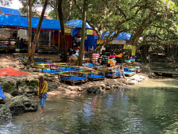 Bahkan warung demi warung terus tumbuh di sekitar lokasi wisata. Menjajakan makanan ringan seperti mie, rujak, hingga baju oleh-oleh bertuliskan Sendang Grogoland. Juga ada kafe kekinian yang kini buka setiap Sabtu-Minggu.
