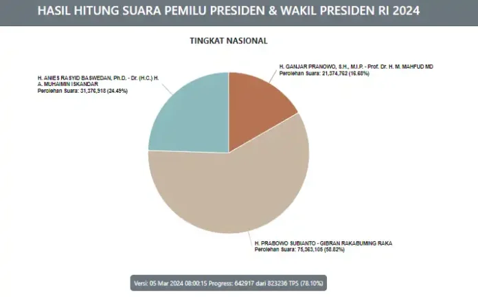 Dilansir dari situs pemilu2024.kpu.go.id, pukul 09.10 WIB, Selasa (5/3/2024), total data yang telah ditampilkan ditampilkan berasal dari 642.917 atau (78,10%) dari 823.236 TPS yang ada di Indonesia.