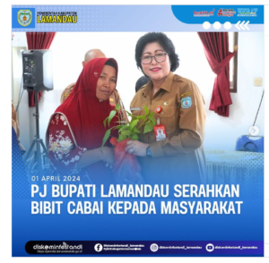Nanga Bulik – Pj Bupati Lamandau Lilis Suriani menyerahkan bibit tanaman cabai secara simbolis, hasil pembibitan oleh dinas Pertanian dan Perikanan Kabupaten Lamandau kepada masyarakat, di aula Kecamatan Bulik, Senin (1/4).