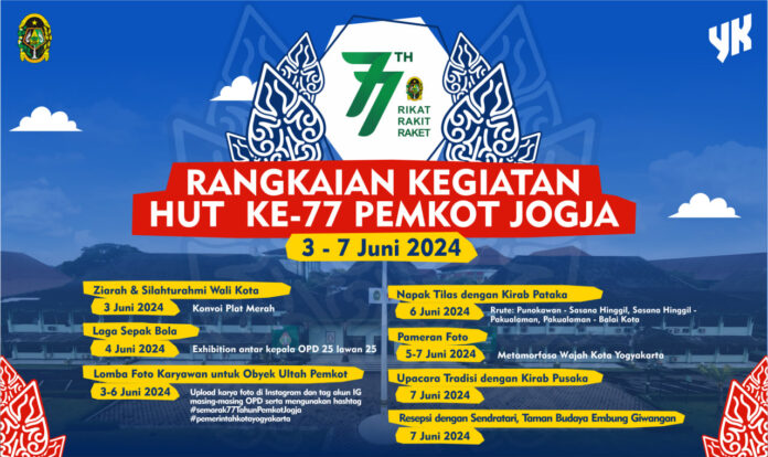 SuaraPemerintah.ID – Dalam rangka memperingati Hari Ulang Tahun (HUT) ke-77, Pemerintah Kota Yogyakarta telah menyiapkan rangkaian acara yang penuh semangat dan kebersamaan. Mengusung tema “Rikat, Rakit, Raket”, perayaan tahun ini diharapkan dapat mempererat tali silaturahmi dan meningkatkan semangat inovasi di kalangan masyarakat.
