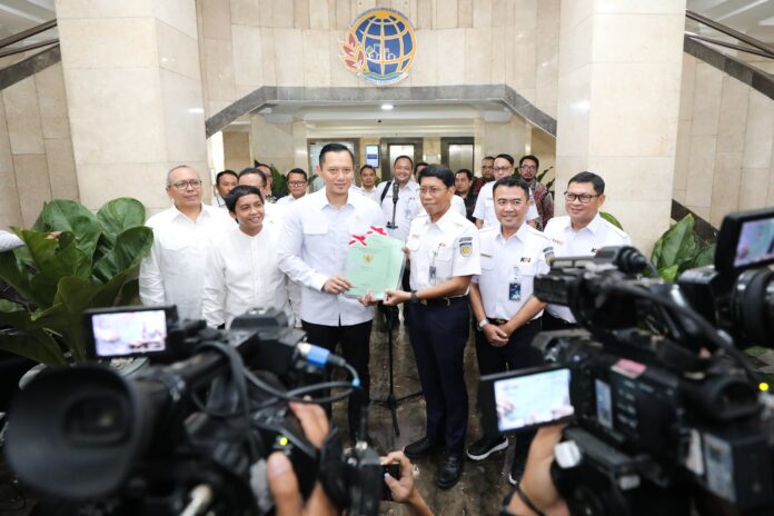 SuaraPemerintah.ID – Menteri ATR/BPN Agus Harimurti Yudhoyono (AHY) menyerahkan dua Sertipikat Hak Pengelolaan (HPL) kepada Direktur Utama PT Kereta Api Indonesia (KAI) Persero di Kantor Kementerian ATR/BPN, pada Kamis (30/05/24).