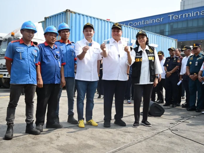 Menko Perekonomian Airlangga Hartarto, Menteri Keuangan Sri Mulyani, dan Wakil Menteri Perdagangan Jerry Sambuaga menyampaikan secara langsung kepada rekan-rekan media tentang pengaturan kembali kebijakan larangan pembatasan barang impor di Jakarta International Container Terminal pada Sabtu (18/5).