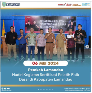 Nanga Bulik – Senin (06/05), bertempat di GOR Nanga Bulik, Pj. Bupati Lamandau yang diwakili oleh Asisten Lingkup Setda Kab. Lamandau menghadiri kegiatan Sertifikasi Pelatih Fisik Dasar di Kab. Lamandau Tahun 2024. Turut hadir Kepala Dipora Provinsi Kalteng, perwakilan Kepala Dispora Se-Kalteng, Kepala Dispora Kab. Lamandau, Ketua KONI Kab. Lamandau serta tamu undangan lainnya.