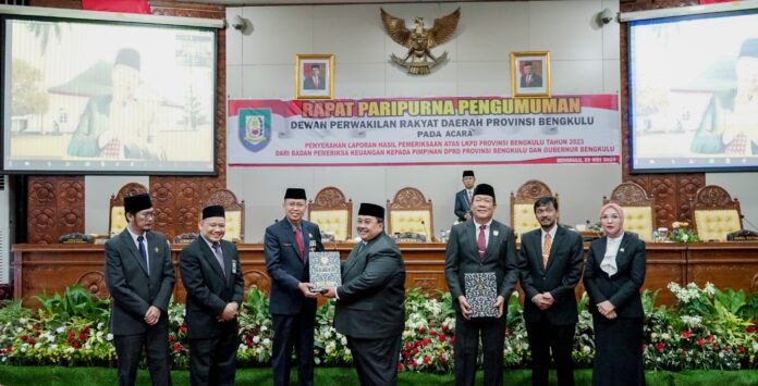 “Berdasarkan hasil pemeriksaan Badan Pemeriksa Keuangan (BPK) termasuk implementasi rencana aksi yang dilaksanakan Pemerintah Provinsi Bengkulu, maka BPK memberikan opini WTP atas Laporan Keuangan Pemerintah Daerah (LKPD) pemerintah Provinsi Bengkulu tahun 2023,” sampai Auditor Utama Keuangan Negara V BPK RI Slamet Kurniawan, saat menyarahkan LHP BPK RI kepada Gubernur Bengkulu dan Ketua DPRD Provinsi Bengkulu,