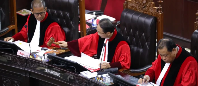 “Dan menggabungkan dengan hasil perolehan suara untuk Partai Demokrasi Indonesia Perjuangan untuk pengisian anggota Dewan Perwakilan Rakyat Kabupaten/Kota Kabupaten Sarmi Daerah Pemilihan Kabupaten Sarmi 2,” ujar Ketua MK Suhartoyo didampingi delapan hakim konstitusi dalam sidang pengucapan putusan di Ruang Sidang Pleno Gedung MK, Jakarta pada Senin (10/6/2024).
