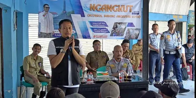 SuaraPemerintah.ID – Penjabat (Pj.) Wali Kota Malang, Dr. Ir. Wahyu Hidayat, MM, berdialog langsung dengan para sopir angkutan kota (angkot) dalam acara Ngobrol Bareng Angkutan Kota (Ngangkut) di Terminal Arjosari, Kota Malang, pada Selasa (9/7/2024). Didampingi oleh Kepala Dinas Perhubungan (Dishub) Kota Malang, Widjaja Saleh Putra, Wahyu mendengarkan berbagai aspirasi yang disampaikan oleh para sopir.