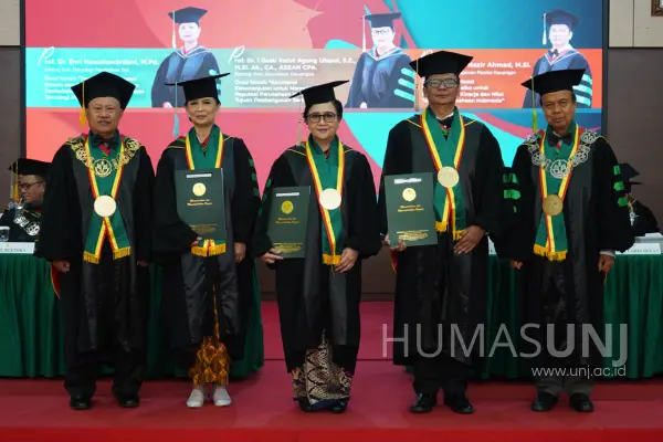 SuaraPemerintah.ID – Universitas Negeri Jakarta (UNJ) menggelar acara sidang pengukuhan untuk tiga Guru Besar Tetap UNJ dari Fakultas Bahasa dan Seni (FBS) serta Fakultas Ekonomi (FE). Ketiga Guru Besar tersebut adalah: (1) Prof. Dr. Dwi Kusumawardani, M.Pd. dari FBS, yang dikukuhkan sebagai Guru Besar Bidang Ilmu Teknologi Pendidikan Tari; (2) Prof. Dr. I Gusti Ketut Agung Ulupui, S.E., M.Si., Ak., CA., ASEAN CPA. dari FE, yang dikukuhkan sebagai Guru Besar Bidang Ilmu Akuntansi Keuangan; dan (3) Prof. Dr. Gatot Nazir Ahmad, M.Si. dari FE, yang dikukuhkan sebagai Guru Besar Bidang Ilmu Manajemen Risiko Keuangan.