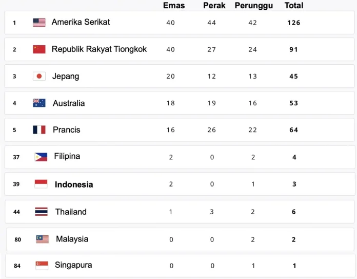 Posisi puncak klasemen akhir Olimpiade Paris 2024 diraih oleh Amerika Serikat (AS) yang mengoleksi 126 medali, yang terdiri dari 40 emas, 44 perak, dan 42 perunggu. Sedangkan peringkat ke-2 adalah Republik Rakyat Tiongkok (RRT) dengan raihan total 91 medali (40 emas, 27 perak, dan 24 perunggu).