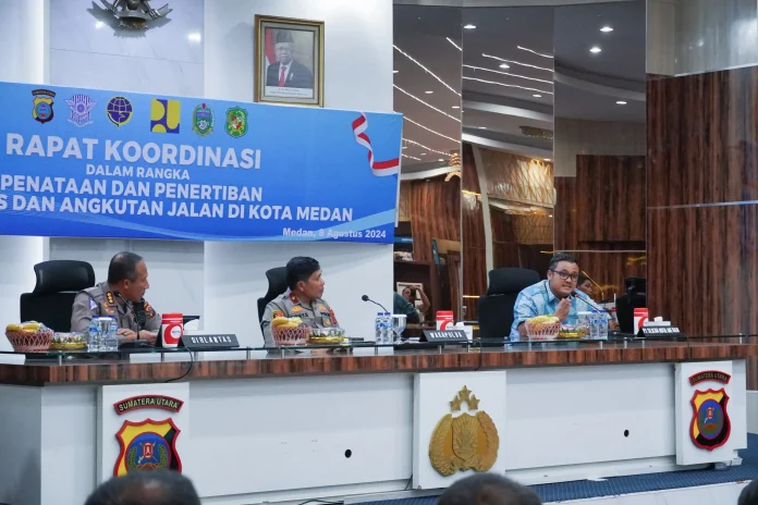 penataan dan penertiban lalu lintas dan angkutan Jalan yang digelar Polda Sumut di Mapolda Sumut, Kamis (8/8/24). Rapat yang dipimpin Wakapolda Sumut Brigjen Pol Rony Samtana ini diikuti pimpinan perangkat daerah terkait di lingkungan Provinsi Sumut dan Pemko Medan serta para camat di Kota Medan dan para Kapolsek.