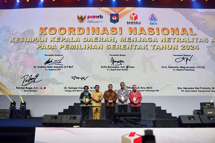 Pada kesempatan itu, Ketua Bawaslu RI, Rahmat Bagja menghimbau seluruh Kepala Daerah untuk menjaga netralitas Aparatur Sipil Negara (ASN) dilingkungan pemerintah daerah masing-masing saat pelaksanaan Pilkada serentak Tahun 2024 yang saat ini tengah memasuki tahapan penetapan pasangan calon kepala dan wakil kepala daerah.