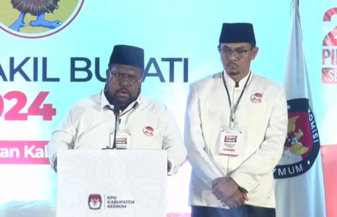 Kegiatan tersebut turut dihadiri oleh ketiga pasangan Calon Bupati dan Calon Wakil Bupati Kabupaten Keerom 2024 yaitu pasangan Petrus Salossa dan Mustakim, Piter Gusbager dan Daud serta Kenius Kogoya dan Nursalim Ar-Rozy.