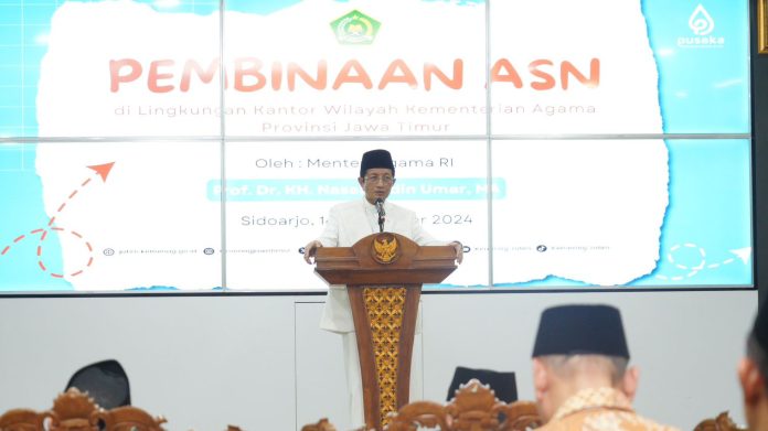 Menteri Agama atau Menag Nasaruddin Umar meminta jajarannya untuk menjunjung tinggi kejujuran dan profesionalitas dalam bekerja. Hal ini disampaikannya dalam kunjungannya ke Kantor Wilayah Kementerian Agama Provinsi Jawa Timur, Kamis (14/11/24).