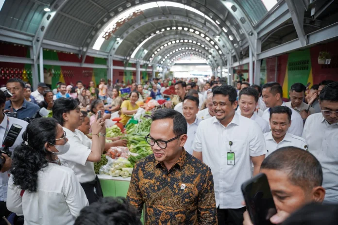 Bersama Wakil Menteri Dalam Negeri (Wamendagri) RI, Bima Arya Sugiarto dan Pj Gubernur Sumatera Utara, Agus Fatoni, Wali Kota Medan, Bobby Nasution meninjau Pasar Rakyat Tradisional Akik yang berlokasi di Jalan Akik, Kelurahan Sukaramai II, Kecamatan Medan Area, Rabu (11/12/2024) siang menjelang petang.