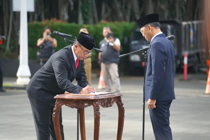 Penjabat Pj Wali Kota Bogor, Hery Antasari resmi melantik Pj Sekretaris Daerah (Sekda), Hanafi di Plaza Balai Kota Bogor, Senin (2/12/2024) pagi.
