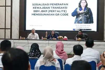 Pj Wali Kota Kediri membuka sekaligus memberikan arahan pada Sosialisasi Penerapan Kewajiban Transaksi BBM JBKP (Pertalite) menggunakan QR Code, Rabu (4/12). Sosialisasi ini bertempat di Ruang Ki Hajar Dewantara BKPSDM Kota Kediri dan menghadirkan narasumber dari PT. Pertamina Patra Niaga Sales Brand Manager Kediri I Fuel Wicaksono Ardi Nugroho.