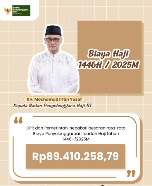 Dalam kesepakatan pemerintah dengan Komisi VIII DPR RI Biaya Penyelenggaraan Ibadah Haji (BPIH) Tahun 1446H/2025M menjadi Rp 89.410.258,79 dengan komposisi Bipih (biaya perjalanan ibadah haji) sebesar Rp 55.431.750,78 (62%) dan nilai manfaat (optimalisasi) sebesar Rp. 33.978.508,01 (38%),