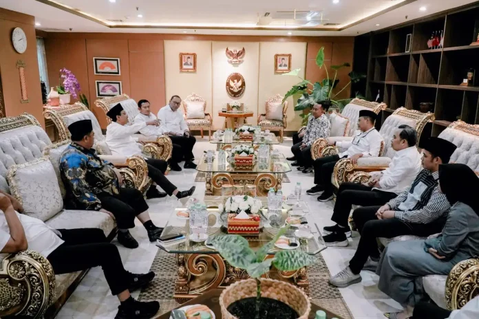 Menteri Sosial (Mensos) Saifullah Yusuf (Gus Ipul) menerima kunjungan empat bupati terpilih dari Jawa Timur (Jatim) di Kantor Kemensos, Salemba, Jakarta Pusat, Rabu (19/2/2025). Mereka adalah Bupati Lamongan Yuhronur Efendi, Bupati Jember Muhammad Fawait, Bupati Jombang Warsubi, dan Bupati Probolinggo Muhammad Haris.