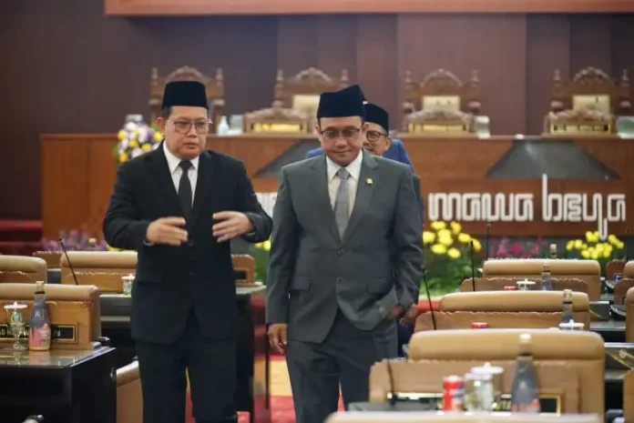 Penjabat (Pj.) Gubernur Jawa Timur, Adhy Karyono, menyampaikan jawaban eksekutif atas pandangan umum fraksi DPRD Provinsi Jawa Timur, terhadap Raperda tentang Perusahaan Perseroan Daerah Jatim Grha Utama (JGU) dan Perusahaan Perseroan Daerah Penjaminan Kredit Daerah (Jamkrida) Jawa Timur di Rapat Paripurna DPRD Jawa Timur,