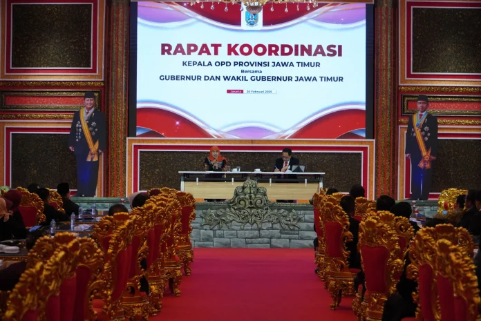 Gubernur Jawa Timur, Khofifah Indar Parawansa dan Wakil Gubernur, Emil Elestianto Dardak langsung bergerak cepat usai dilantik dengan menggelar rapat koordinasi Kepala Perangkat Daerah (PD) Provinsi Jawa Timur di Kraton Majapahit Jakarta, Kamis (20/2/2025) guna memperkuat sinergi dan merumuskan langkah strategis pembangunan.