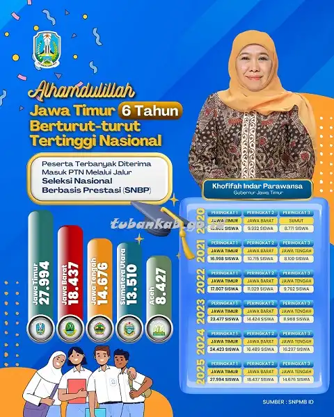 Capaian ini mengantarkan Jawa Timur sebagai Provinsi terbanyak nasional yang berhasil meloloskan muridnya masuk PTN melalui jalur SNBP untuk enam tahun berturut turut, sedangkan tahun 2025 ini dengan persentase sebesar 26,35 persen.