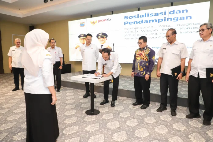 Kegiatan tersebut dihadiri narasumber dari Kementerian Pendayagunaan Aparatur Negara dan Reformasi Birokrasi (KemenPAN-RB), turut dilakukan penandatanganan pakta integritas oleh 56 pejabat organisasi perangkat daerah (OPD) se-Pemkot Cimahi.