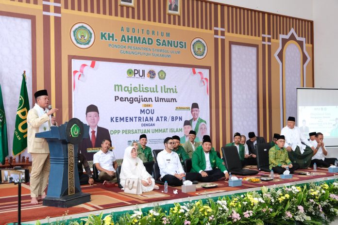 Menteri ATR/BPN, Nusron Wahid, menandatangani Nota Kesepahaman (MoU) yang meresmikan kerja sama dengan Dewan Pimpinan Pusat (DPP) Persatuan Ummat Islam (PUI), di Pondok Pesantren Syamsul ‘Ulum, Kota Sukabumi, Rabu (16/04/25).